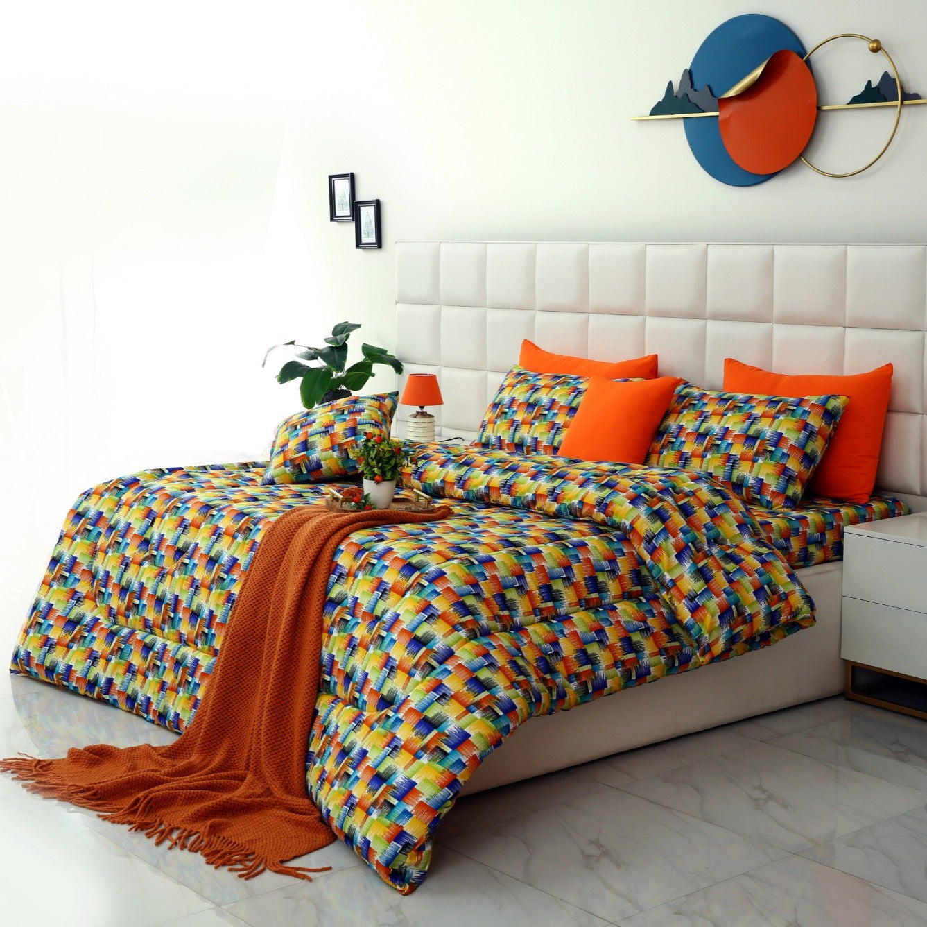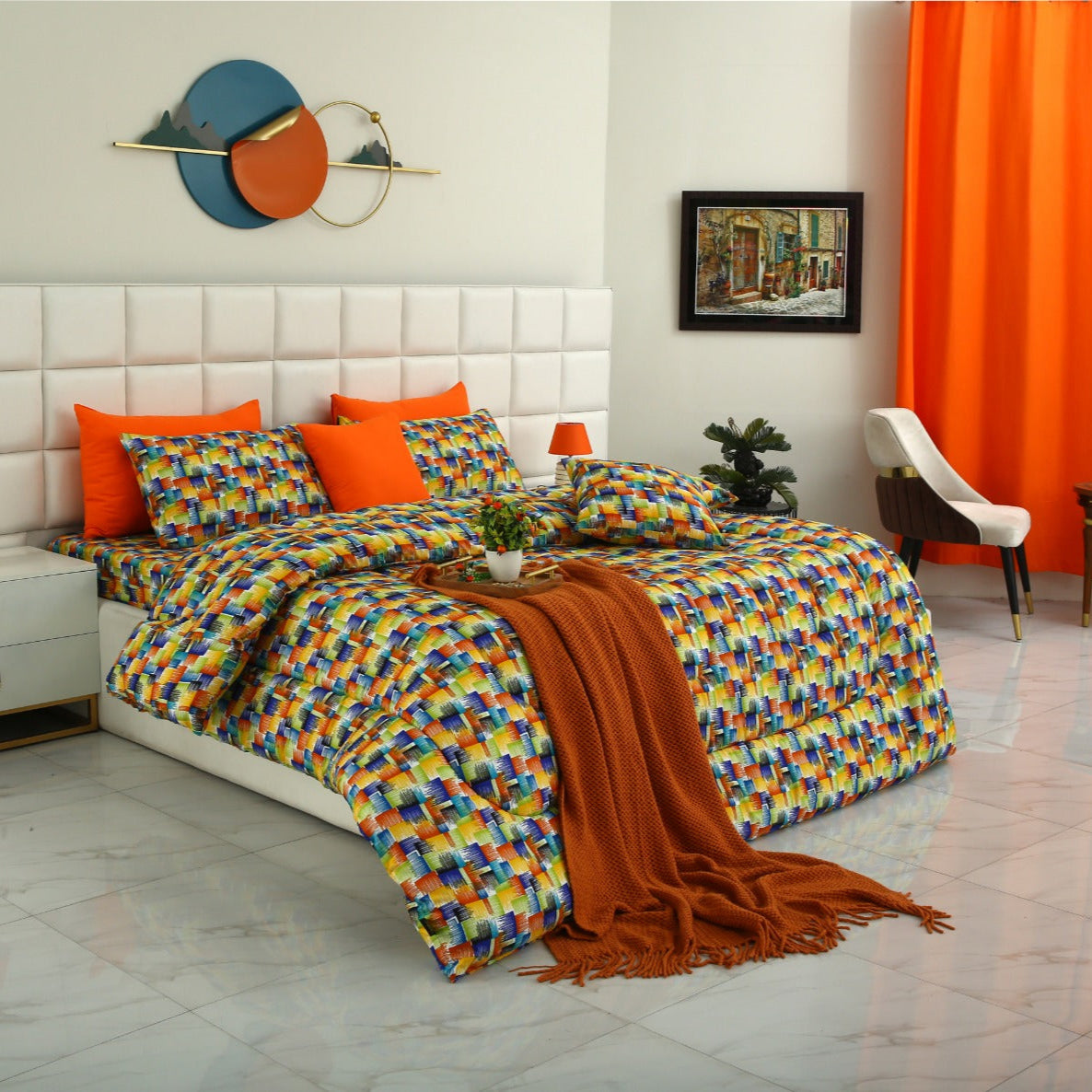 (One King bed sheet +4 Pillow Covers + 2 Cushion Covers +One Filled Comforter 350GSM ) - Material: Rich Cotton & Micro Satin