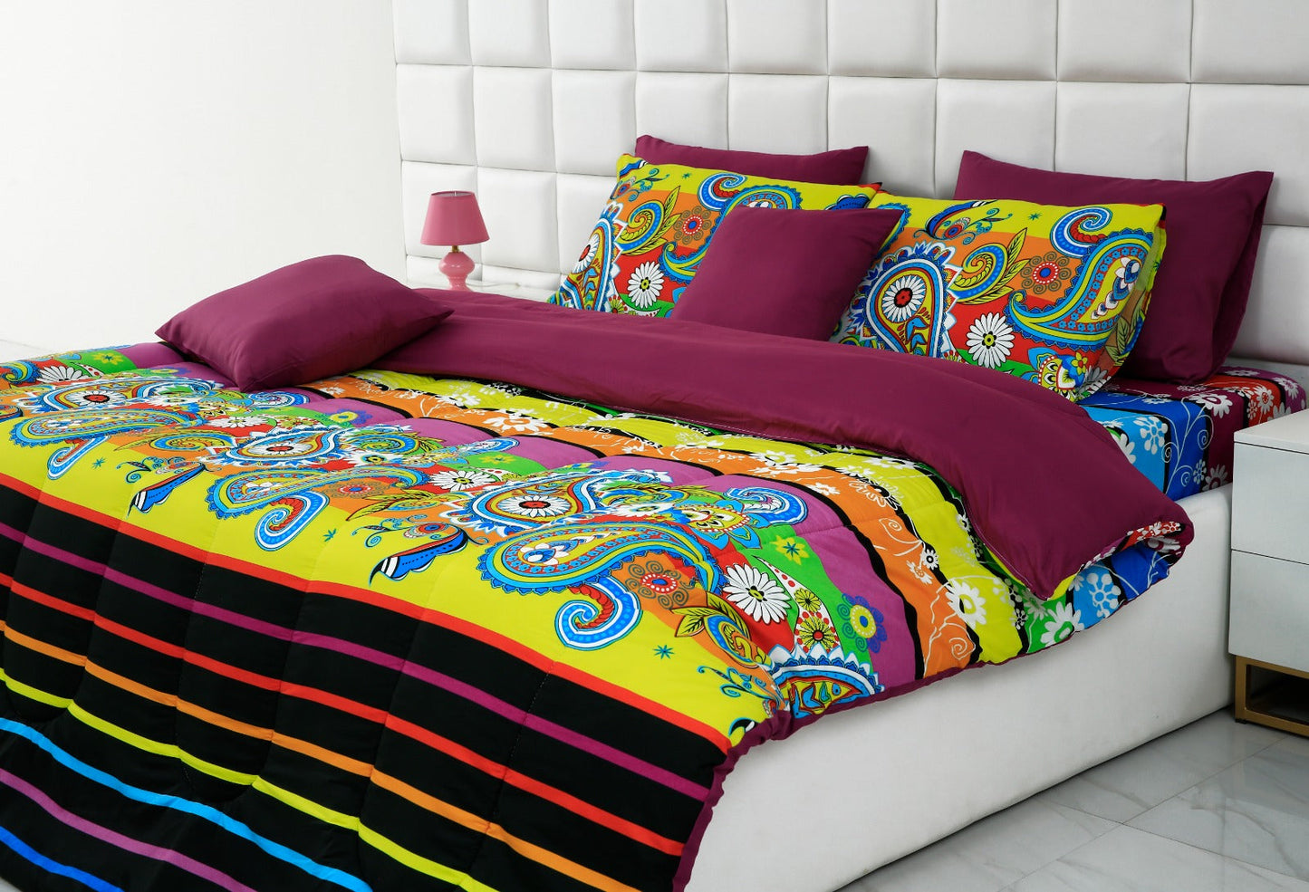 (One King bed sheet +4 Pillow Covers + 2 Cushion Covers +One Filled Comforter 350GSM ) - Material: Rich Cotton & Micro Satin