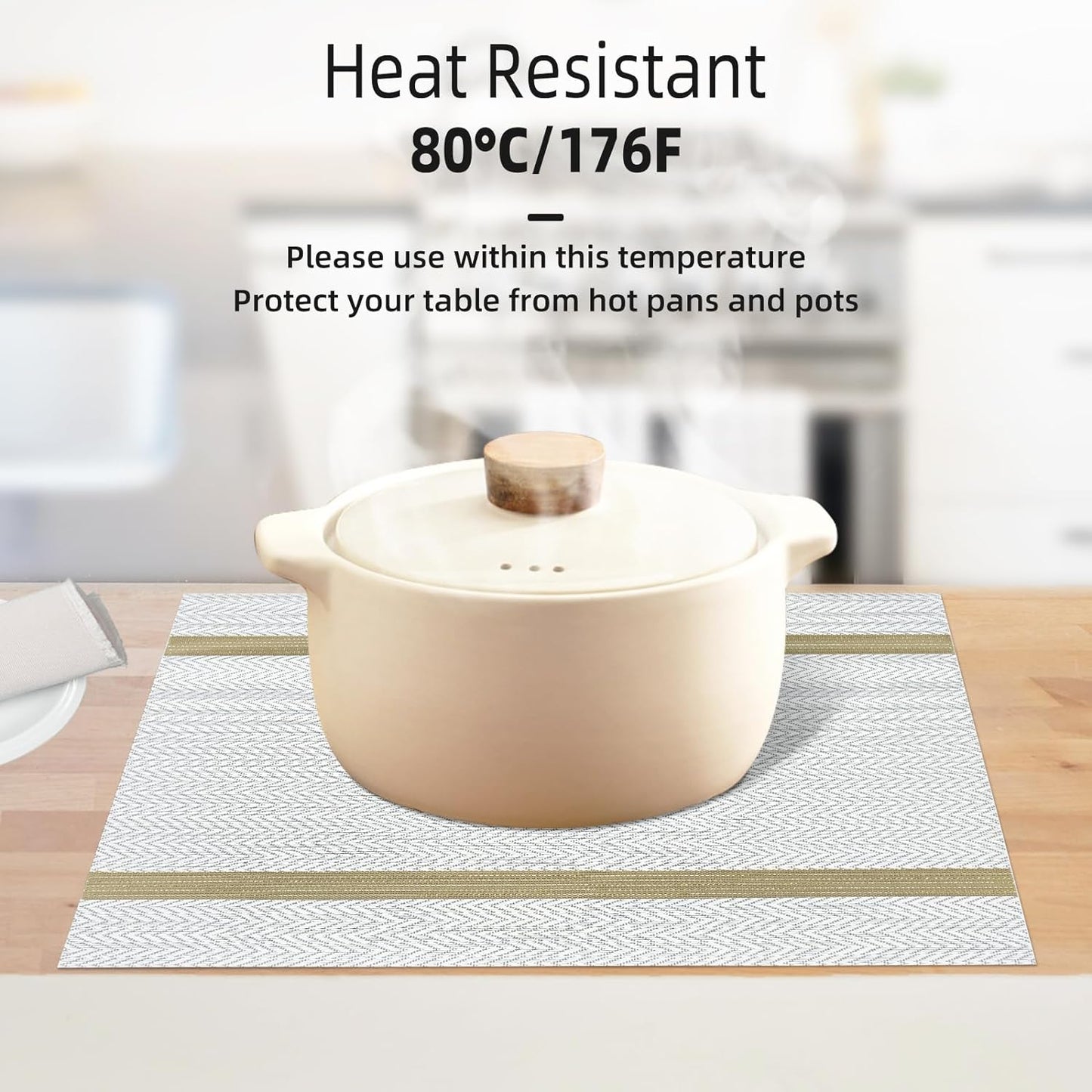 - 1, Premium Quality Material: the set of 6 placemat are made out of high quality vinyl woven, which are not only heat resistant up to 185°F(85℃), but also eco-friendly and washable for repeated times.