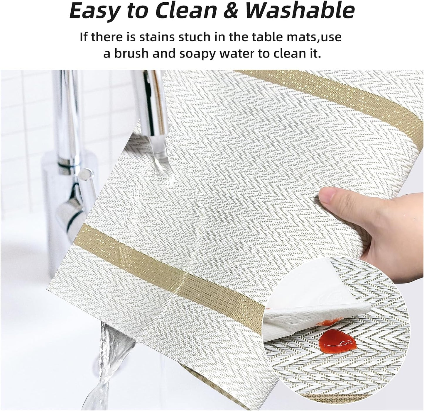 - 5, Washing Instructions and Friendly Reminder: The placemats set is machine washable, Wash placemat separately from other articles and no bleach to maintain its true colors. And woven mats so that liquid may leak through it lightly. Please keep everything in mind.